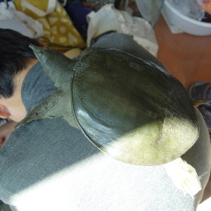 稲作シーズンも終わり、水がなくなった用水路に水溜りができていました。そこに魚が濃縮されるのですが、だいたい網で掬って水の多い川にリリースしました。その水溜りにはもう魚はほとんど残っていなかったのですが、そこに1匹の赤ちゃんスッポンがいることがわかりました。行き場を失っていました。