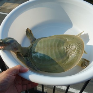 この赤ちゃんスッポンを網で掬って連れて帰りました。結局1週間後にリリースしたのですが、2023年3月30日現在、今も元気で生きているかどうかはわかりません。生きていてほしいです。