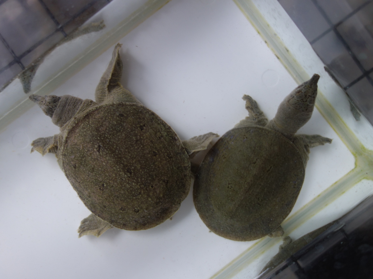 ↑アイキャッチ画像のスッポンは2019年10月17日に保護した赤ちゃんスッポンで、飼育1250日目を迎えたのですが、現在の甲長がまだ8cmにとどまっている「かみつき」ちゃん(左側)です。右側は例外的に仲良しのチャレンジャー。(2023年3月21日13:56撮影)