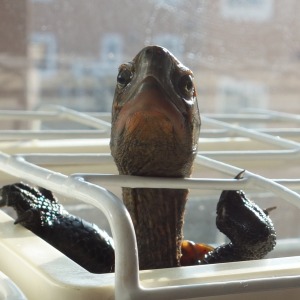 小さい頃に4匹を同じガラス水槽に入れて飼育していた時、だんだん成長して大きいのが小さいのを襲うようになってきた時に甲羅の最後部を噛まれて欠けてギザギザになってしまいました。多頭飼いの期限の見極めの難しさを痛感した出来事でした。その後、この子は(本当に例外的ですが)もう1匹(チャレンジャー)と一緒に入れると仲良く暮らせることがわかったので、現在まで日中は一緒にガラス水槽に入れています。ただし、夜はそれぞれ単独でプラスチック容器に入れています。いつまで続くかわかりませんが、物理的に問題ないあまり大きくないうちは大丈夫だと思います。