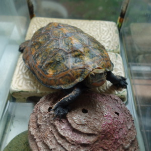 2匹目の赤ちゃんスッポンにもヒルが吸い付いていました。金魚鉢の横から撮影した写真では鼻の上に吸い付いているのがわかります。赤くなっています。(2018年9月28日17:25撮影)
