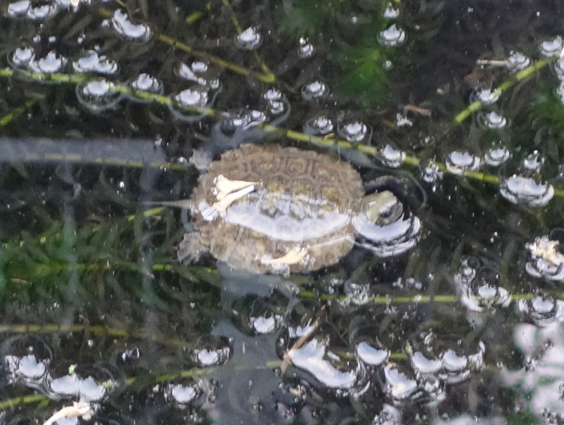 2019年7月17日に近所の住宅地の水かさの増した側溝で水面から露出したアナカリスに乗ってじっとしているカメがいました。私は夕方のウォーキングに行く途中でした。そのままウォーキングを続けました。そして30分ぐらいして帰りにまたその場所を通ると、そこにまだいました。ここは通常ならカメがいるような場所ではありません。コンクリートの用水路を陸地が見つからないままずっと泳ぎ続けて、上流域の住宅地の側溝まで迷い込んで、泳ぎ疲れたイシガメがそこに茂っていたアナカリスに載って水面で休んでいたのではないでしょうか。私が気づいてからだけでも同じ場所に30分以上はじっとしていました。