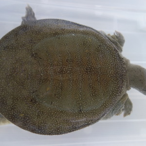 朝に起こした時に角型たらいの中でまだ寝ぼけている飼育1149日のスッポン --- The soft-shelled turtle that has been...