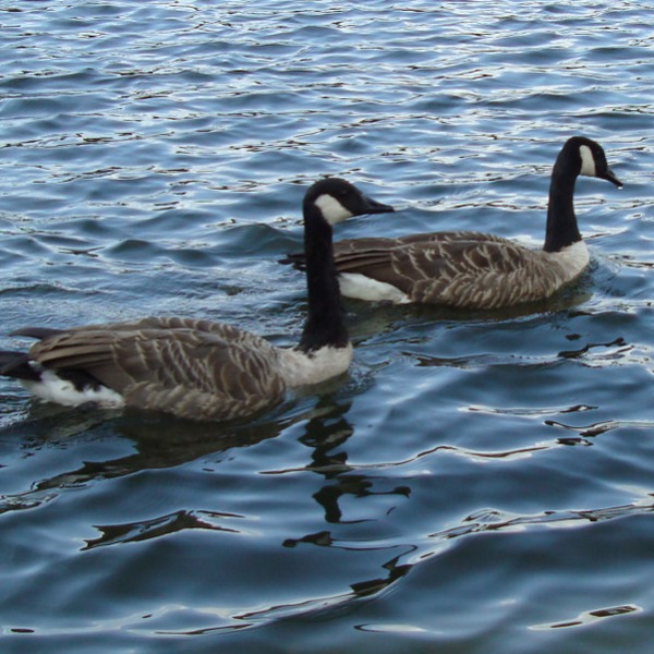 - 夕方の用水路でとても速く泳ぐカルガモの親子 — A spot-billed duck parent accompanied by its child swimming very fast in an irrigation channel early in the evening(2025年6月6日17:25撮影)
