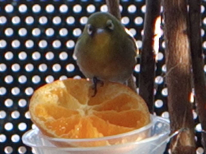 - ほんの2メートルぐらい先でみかんを食べているつがいの片方のメジロ — One of a pair of white-eyes was eating sliced mandarine orange keeping only about 2 meters away from me(2025年1月1日16:06撮影)