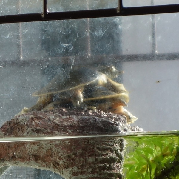 カメ島の上で重なって日光浴をしている飼育43日目の2匹の赤ちゃんスッポン