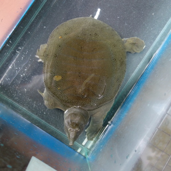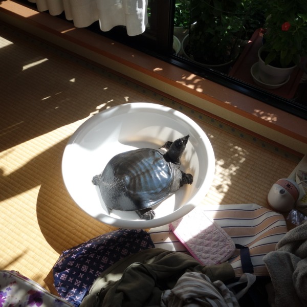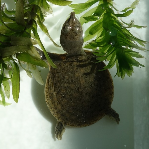 リビングの水槽の中で日光浴をしている飼育7日目の赤ちゃんスッポン