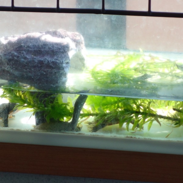 朝に窓辺に置いたガラス水槽内の飼育24日と19日の赤ちゃんスッポン