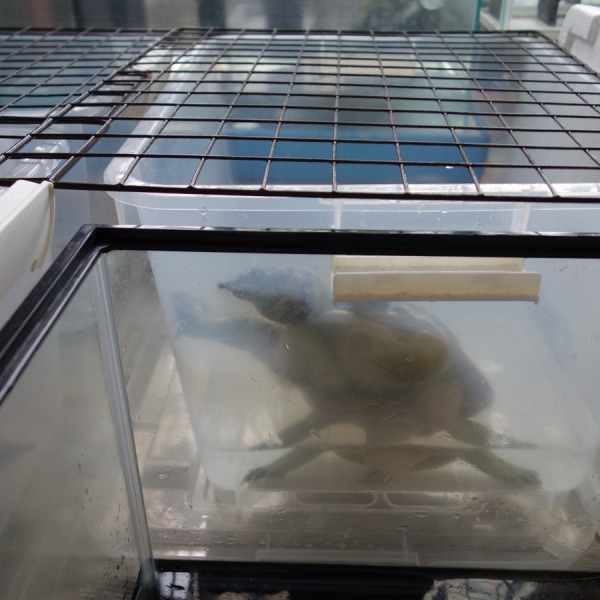 ワイヤーラティスから顔を出して引っ込めた日齢1444日のスッポン♂