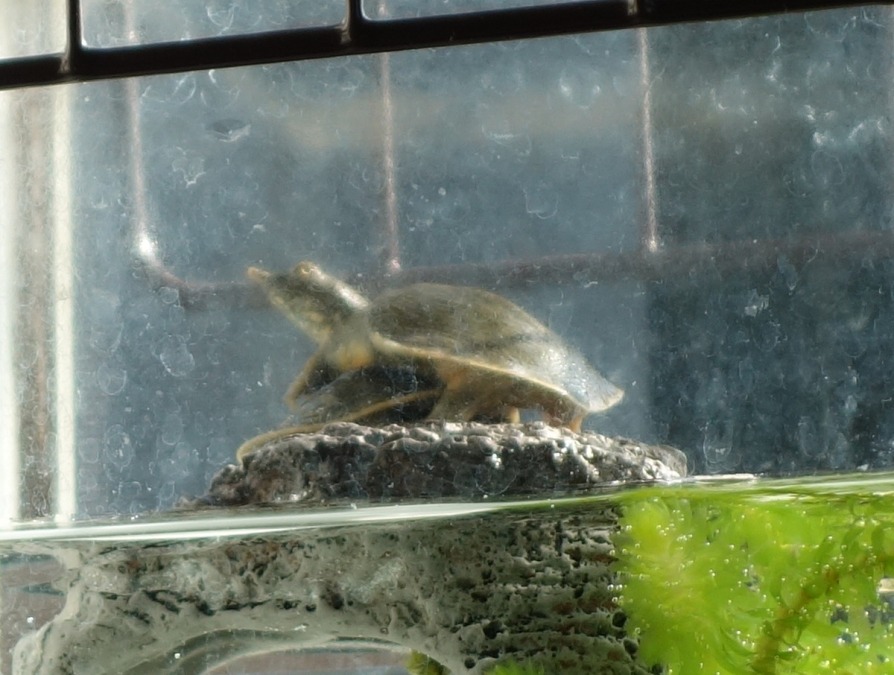 4匹の赤ちゃんスッポンの中の3番目と最後に保護した2匹がリビングに入ってくる直射日光で重なって日光浴をしていました。下が3匹目で上が4匹目。この2匹はよく日光浴をします。