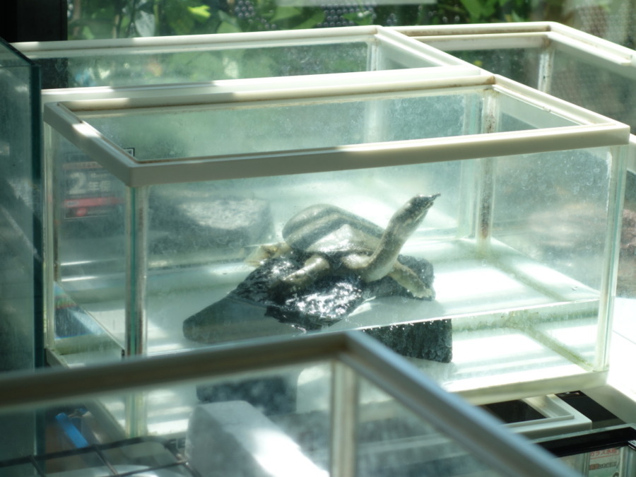 ガラス水槽の中で甲羅干しを始めた飼育363日目のスッポン