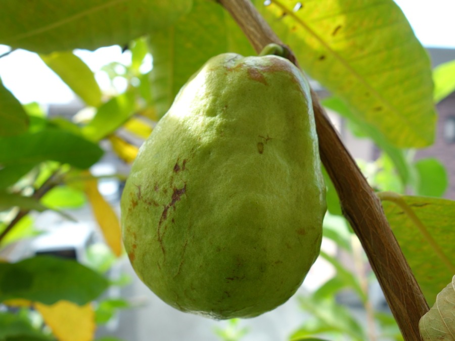 私がベランダで栽培しているバンジロウの実生に2024年は実が1個だけ実りました。蕾は4個あったのですが、3個は落ちて残った1個です。ここ数日で果実の色が白っぽくなったような気がします。つまり、収穫時期が近いのではないでしょうか。