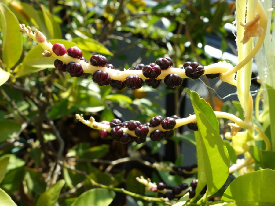2023年10月上旬には種ができていました。それからさらに2ヶ月半ぐらい経った時点での別のツルムラサキ緑茎種の種(2023年12月28日10:18撮影)