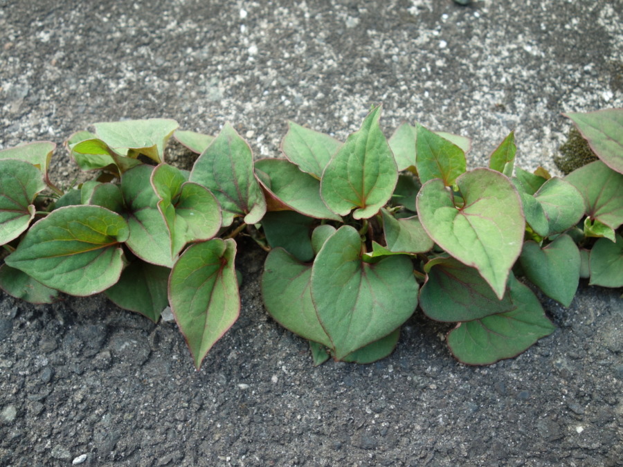道路のガードレール下のコンクリートとアスファルトの境目に生えていたドクダミ(毒痛み、蕺草とも書く)。