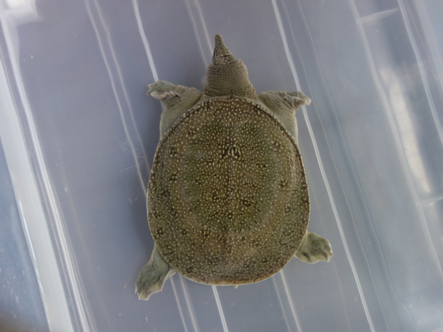 病気がちですが何とか凌いでここまで成長しました。甲長は16.5cmで、2ヶ月遅く保護した赤ちゃんスッポンに大きさで抜かれてしまいましたが元気で生きていることが一番です。甲羅の形は普通の楕円形です。