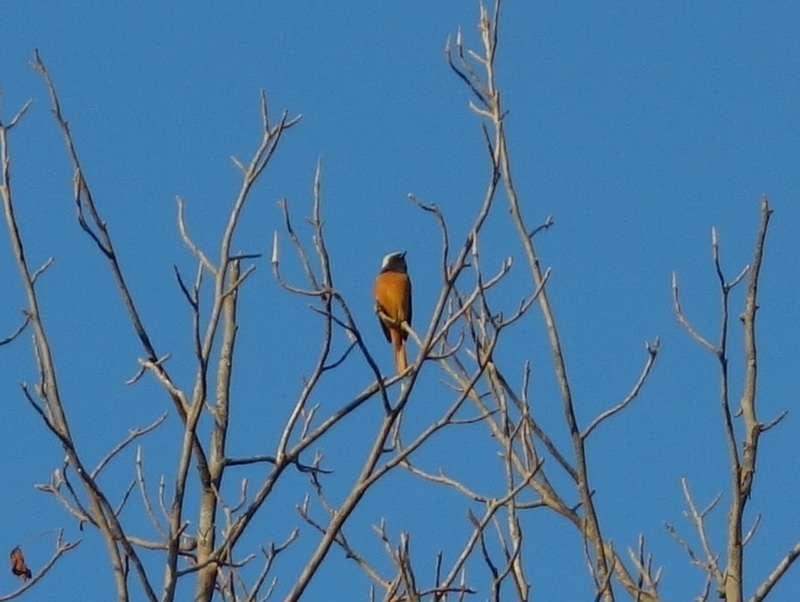 夕方に公園の大きいユリノキの上で、1羽のオスのジョウビタキが鳴いていました。
