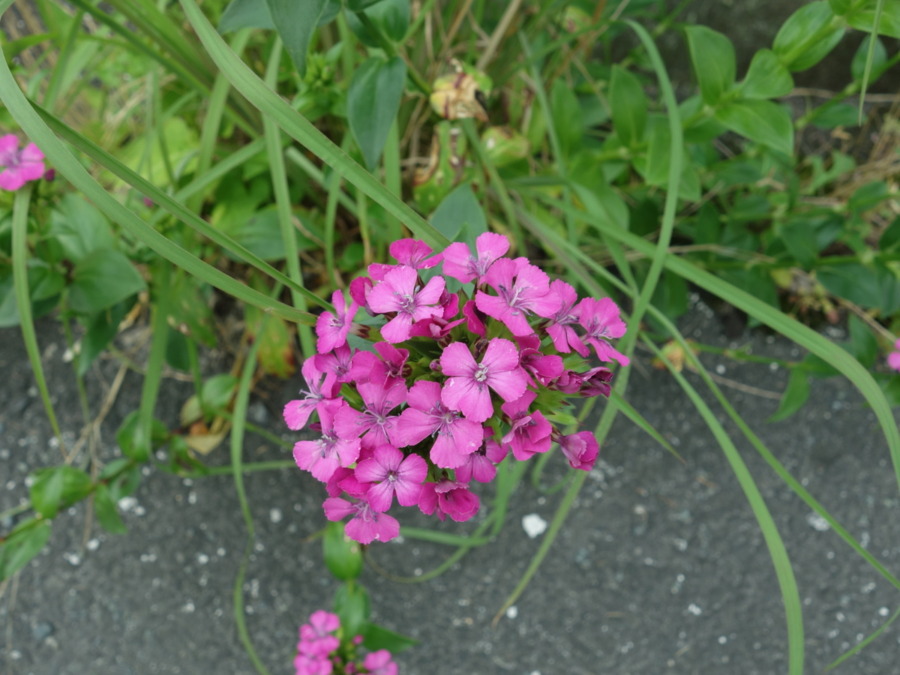 アスファルトの道路の脇のガードレールのところに咲いていたハマナデシコ(浜撫子)の花。
