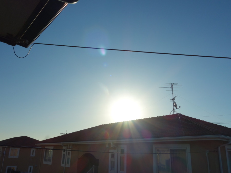 2023年12月18日の朝のベランダから見えた東の空(というより南東方向の空)の太陽。