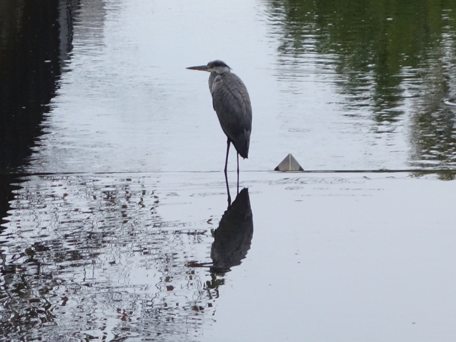 夕方の公園のところをウォーキングしている時に、用水路の段差の上に1羽のアオサギが立っているのを橋の上から見つけました。