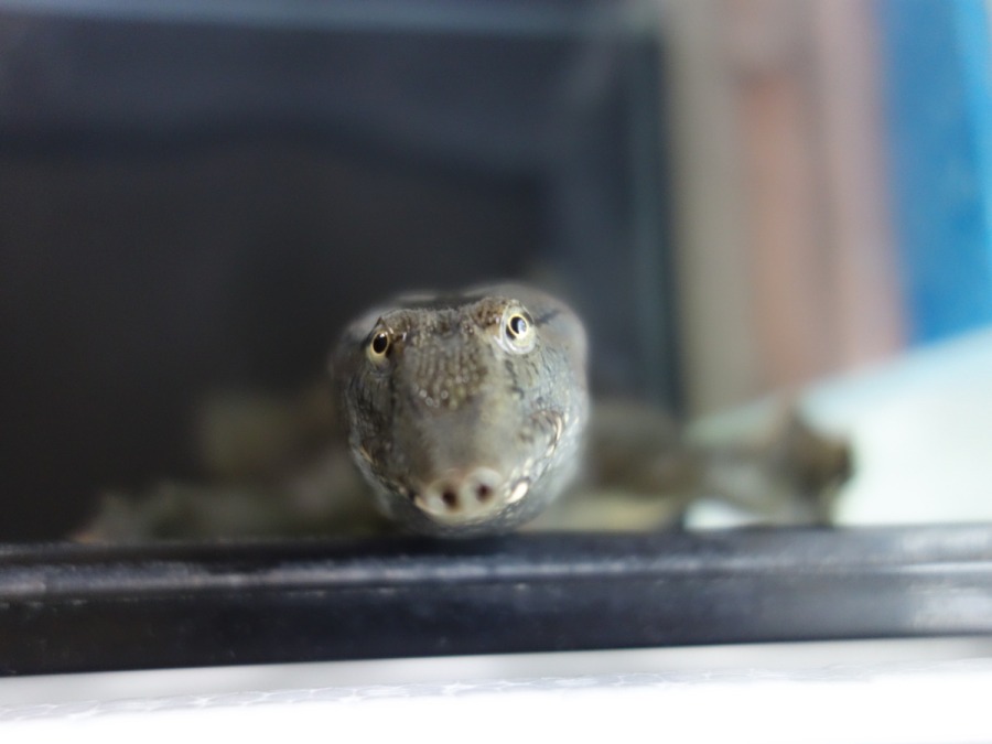 日齢1326日目の5匹のスッポンのうち、2番目に成長している扁平ちゃん♂がガラス水槽の中から上にいる飼い主に向かって首を伸ばしているところ。