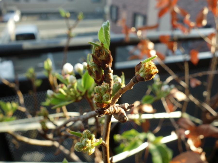 ベランダの鉢植えの洋梨ル・レクチェの蕾。