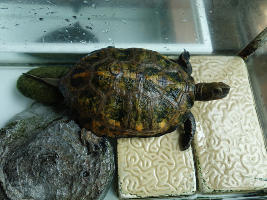 飼育1039日のニホンイシガメが昼前に陸場に上がっていたので写真を撮ろうとしたらカメラ目線でこちらを見たところ。