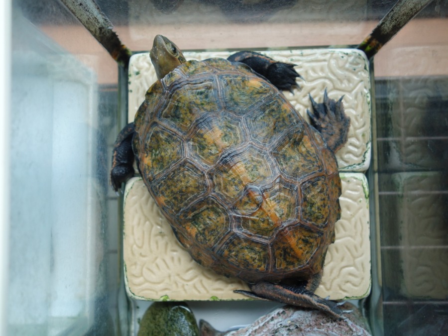 リラックスして甲羅干ししている飼育1144日目のニホンイシガメ