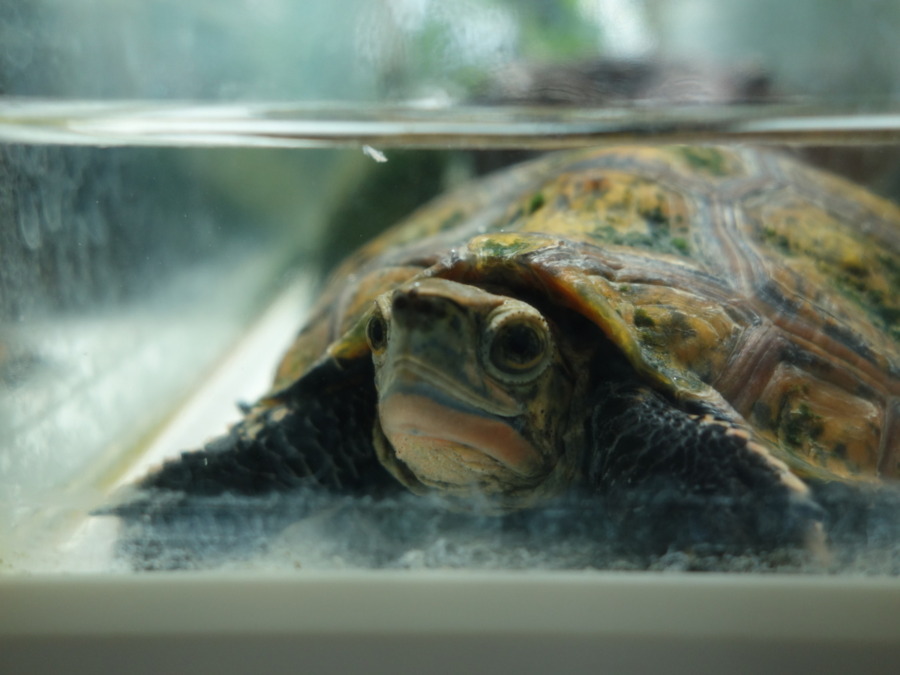 飼育1153日のニホンイシガメの顔をガラス水槽の側面から撮影。