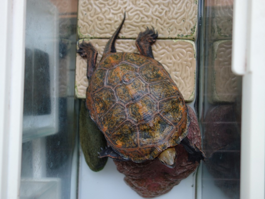 飼育1159日目のニホンイシガメがカメ島の上で甲羅干ししているところ。