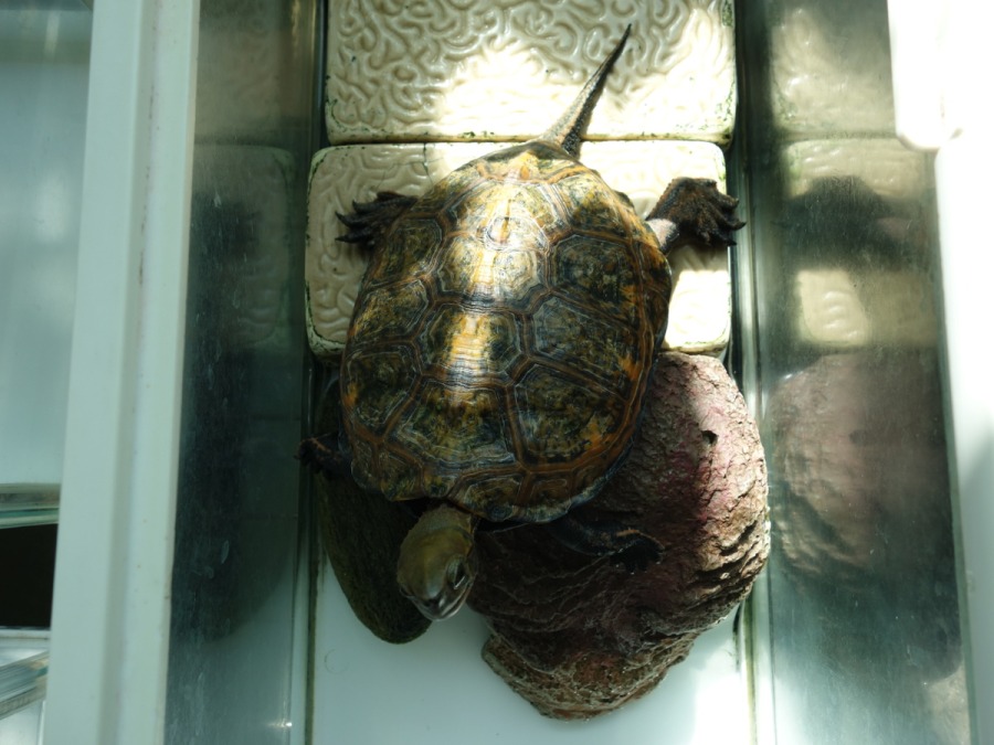 飼育1187日のニホンイシガメが甲羅干ししているところ。