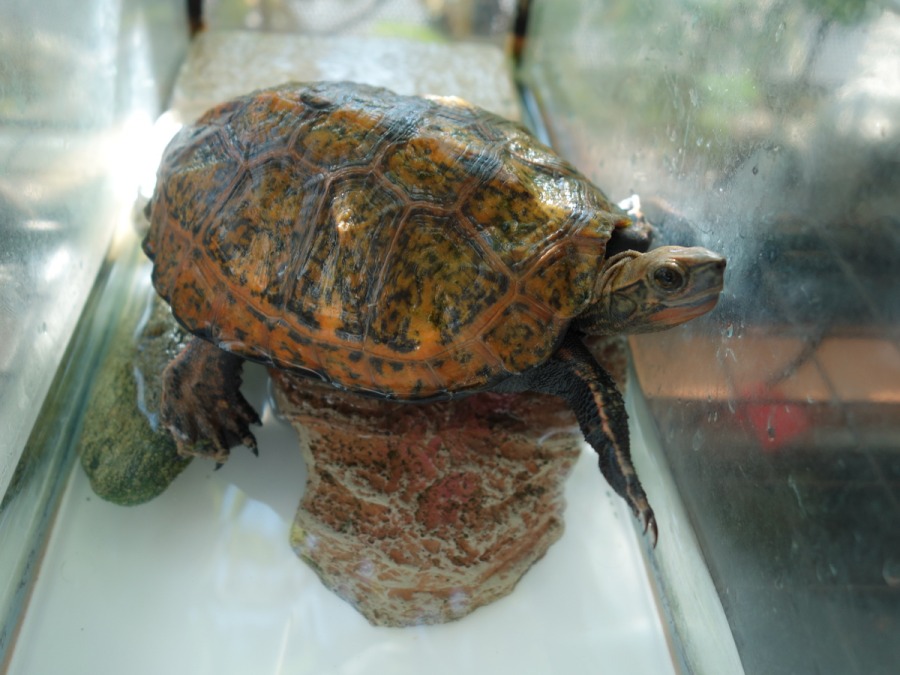 飼育1259日のニホンイシガメが飼い主に手を振っているところ。