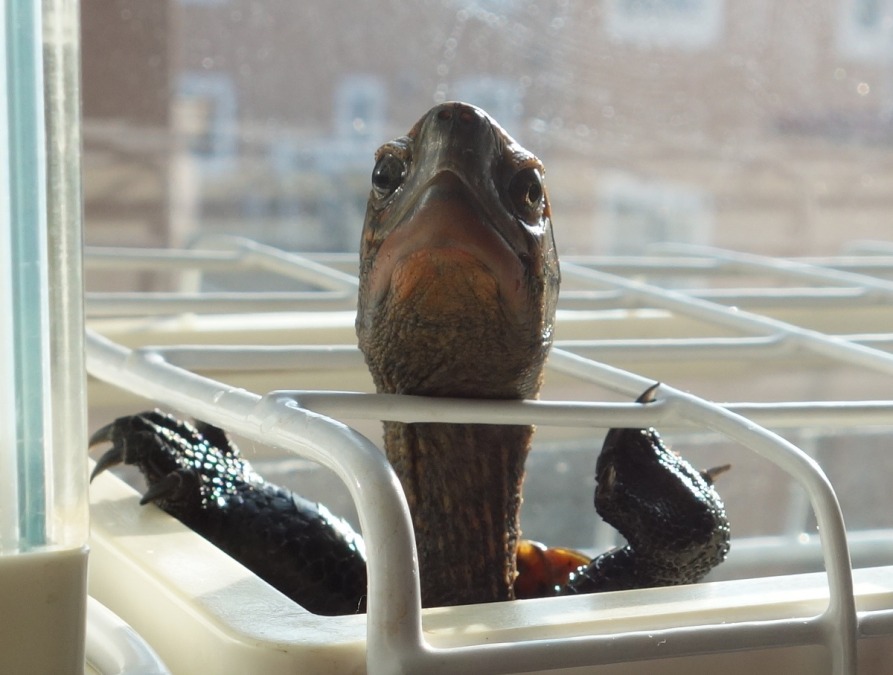窓辺で日光浴中に水槽の蓋から顔を出している飼育1614日のニホンイシガメ♂