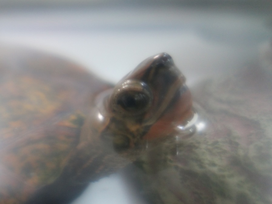 飼育1780日のニホンイシガメ♂の顔を水槽の側面から撮影。