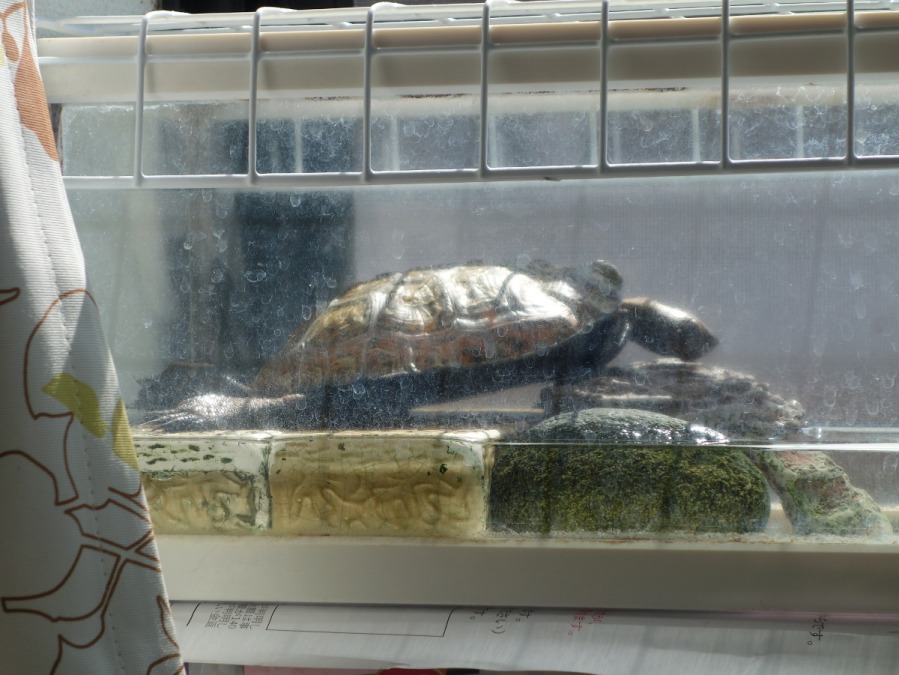 ニホンイシガメ飼育1784日のニホンイシガメ♂が日光浴しているところ。
