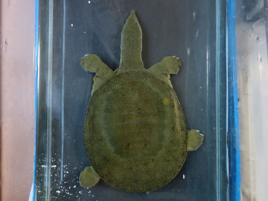 日齢1302日のスッポン5匹のうち、いちばん大きい1匹はウグイス色。