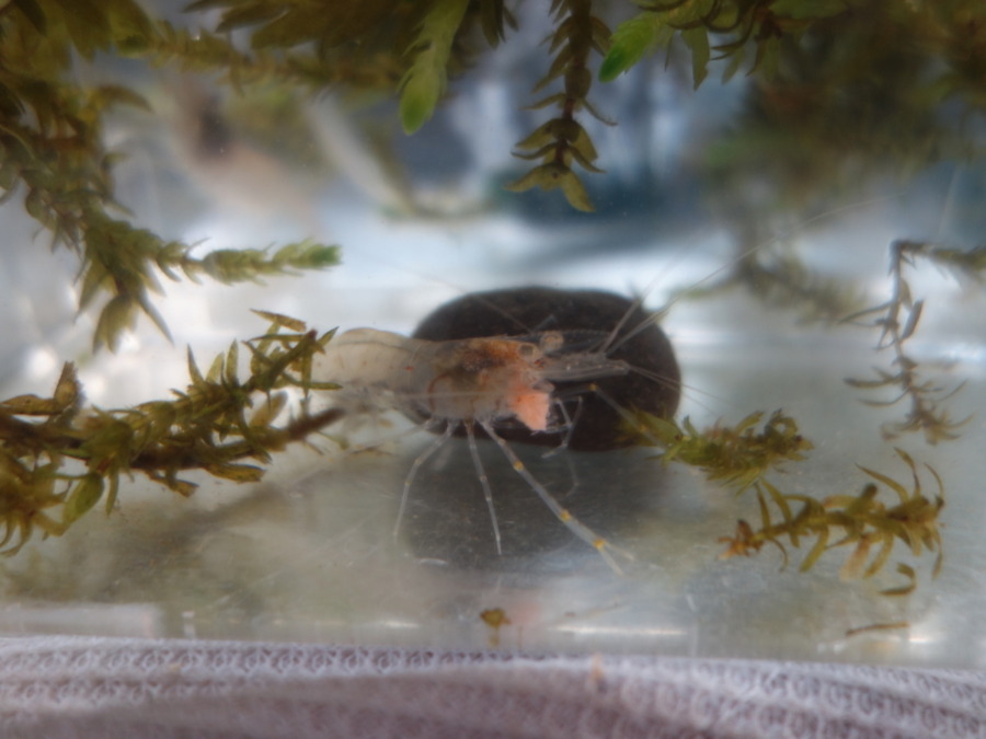 飼育容器の中にいるテナガエビにピンセットでサケの切り身を与えると瞬時に奪い取って食べ始めます。