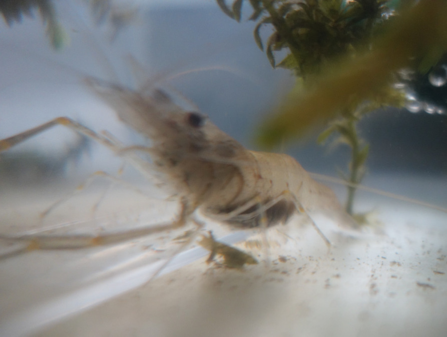 現在生き残っている2匹のうち、小さい方のテナガエビがサケの刺身の断片を食べているところ。