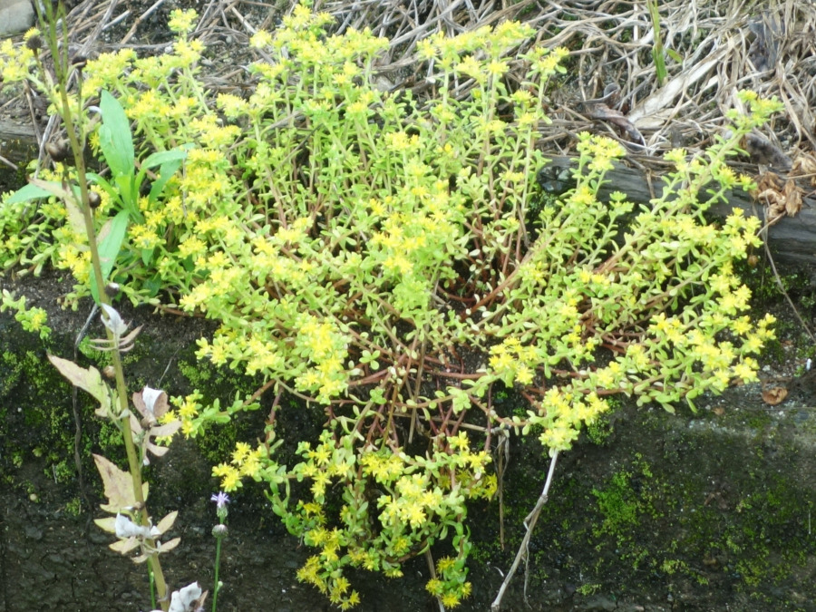 夕方のウォーキングでゴルフレンジの横にある用水路の土手に咲いていたツルマンネングサ(蔓万年草)。