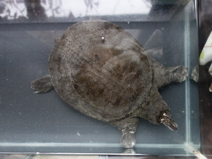 オスにしてはわりと大人しめのスッポンで、現在の甲長は21cmぐらいです。思い通りにいかないと手を噛みます。オスに特有の行動です。体はけっこう汚れが目立ちます。テッィッシュペーパーで背甲を拭くと体色と同じ色が付きます。