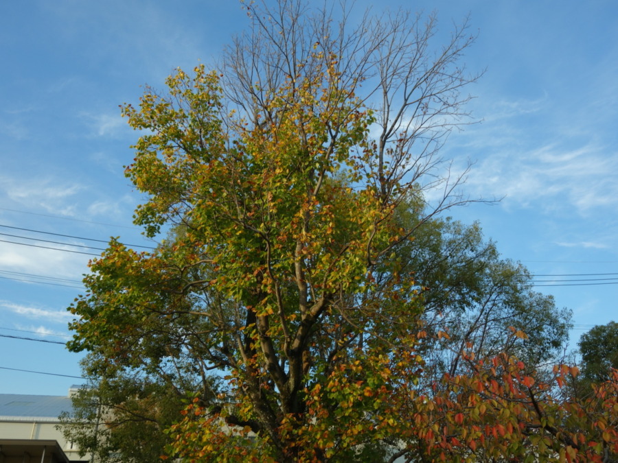 秋の空は青くてきれいです。大気圏の粒子が小さいから波長の短い光(青い光)を散乱するので青く見えます。朝焼けや夕焼けは大気圏の粒子が大きくて波長の長い赤い光を散乱するので赤く見えます。ユリノキの上の方の葉っぱのない枝は落葉しただけで枯れているわけではないと思われます。