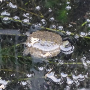夕方に住宅地の側溝のアナカリスの上にいたニホンイシガメの幼体