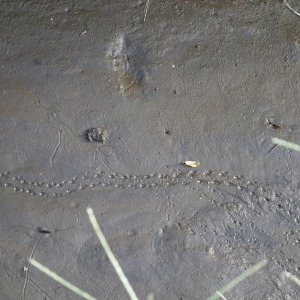 水のなくなった用水路の赤ちゃんスッポンの足跡