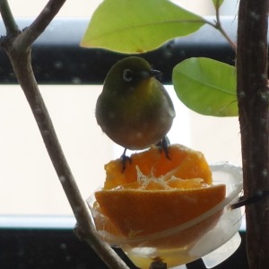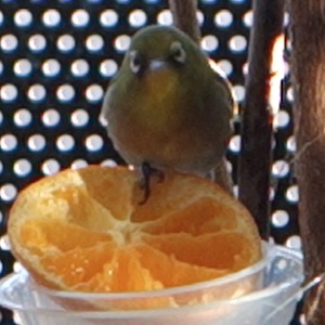 交替でみかんを食べるつがいのメジロ